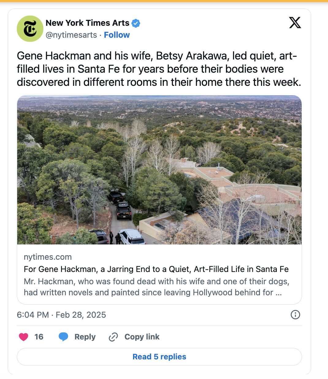 Tras una inspección más detallada de la casa, se encontró a Hackman, la estrella de Mississippi Burning, en el suelo de lo que se cree que es un vestíbulo, con un bastón y unas gafas de sol cerca de él. Tanto Hackman como Arakawa, con quien se casó en 1991, parecen haber caído repentinamente. Además, sus cuerpos estaban en descomposición.