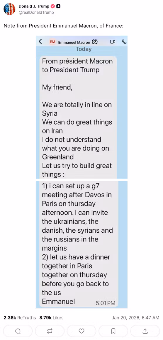 «Amigo mío, estamos totalmente de acuerdo en lo relativo a Siria. Podemos hacer grandes cosas con Irán. No entiendo lo que estás haciendo con Groenlandia. Intentemos construir grandes cosas: 1) Puedo organizar una reunión del G7 después de Davos en París el jueves por la tarde. Puedo invitar a los ucranianos, los daneses, los sirios y los rusos al margen. 2) Cenemos juntos en París el jueves antes de que regreses a Estados Unidos. Emmanuel».